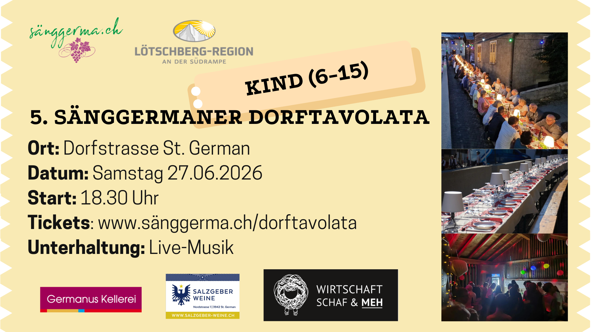 Ein Platz für ein Kind (10-16) am Tisch der 5. Sänggermaner Dorftavolata.